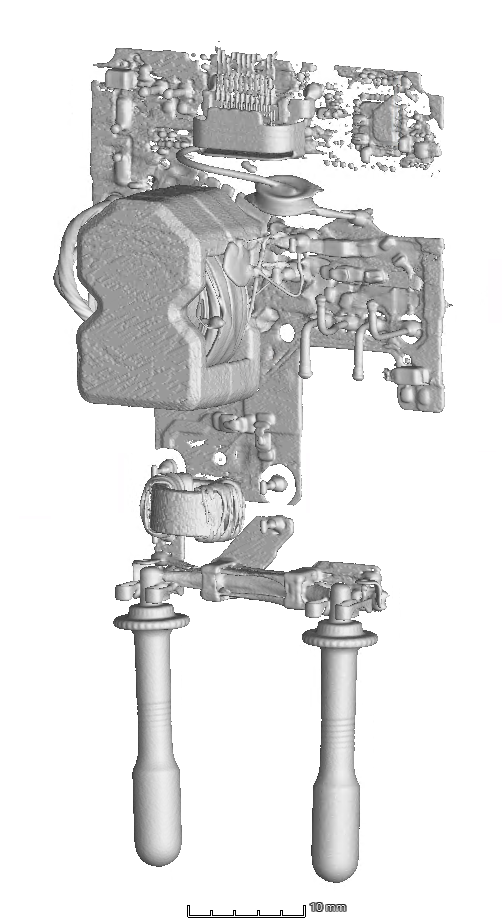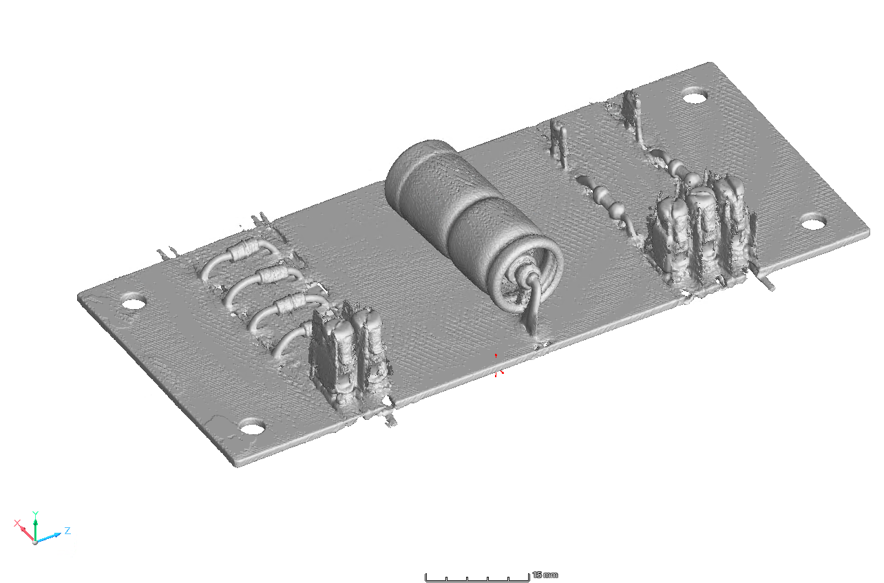 Im Rahmen des PEMOWE-Projekts wurde ein elektronisches Testboard mittels Mikro-Computertomographie (µCT) vollständig dreidimensional erfasst. Im gezeigten Bild ist ein Isosurface-Rendering zu sehen, das die feine innere Struktur eines zylindrischen Kondensators sowie umliegender passiver Komponenten visualisiert. Die µCT-Technologie erlaubt dabei eine zerstörungsfreie Einsicht in die Lötstellen, die Geometrie der Wicklungen sowie die Kontaktierung der Bauteile – selbst unter lichtundurchlässigen Gehäusen.
