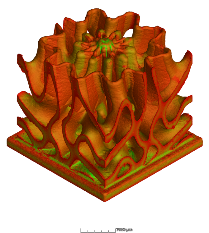 Die thermische Leistungsfähigkeit moderner elektronischer Systeme ist maßgeblich von der Geometrie und Integrität eingesetzter Kühlkörper (Heatsinks) abhängig. Im vorliegenden Beispiel wurde ein additiv gefertigter Heatsink mittels hochauflösender Mikro-Computertomographie (µCT) bei einer Voxelgröße im Mikrometerbereich analysiert, um sowohl die äußere Struktur als auch die inneren Geometrien zerstörungsfrei zu charakterisieren. Die komplexe, gitterartige Architektur mit geschwungenen Stegen und variierenden Wandstärken stellt hohe Anforderungen an die Fertigungsqualität sowie an die messtechnische Erfassung.